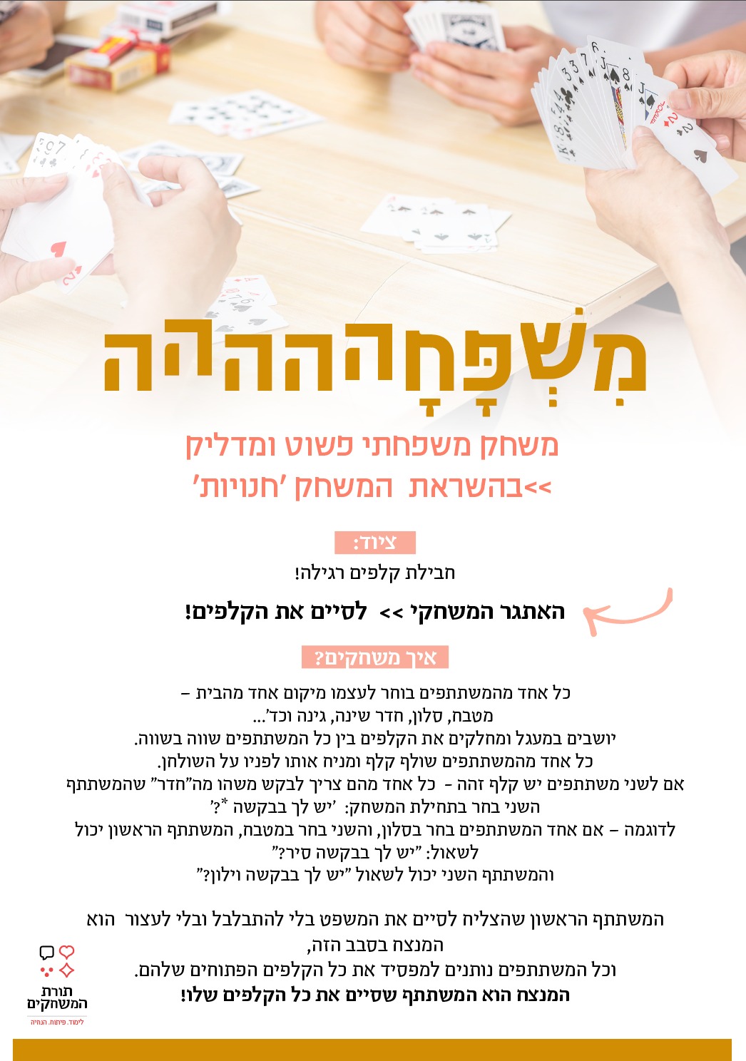 כל אחד מהמשתתפים בוחר מיקום אחד מהבית – מטבח/סלון/חדר שינה/גינה וגו'…